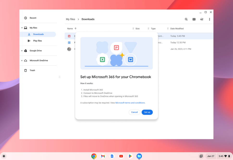 ユーザーには、Microsoft 365 Webアプリをインストールし、Microsoft OneDriveをChromebookファイルアプリに接続するプロセスを通じて、ガイド付きセットアップエクスペリエンスが提供されます。ファイルは、Microsoft 365アプリで開くときにMicrosoft Onedriveに移動されます。