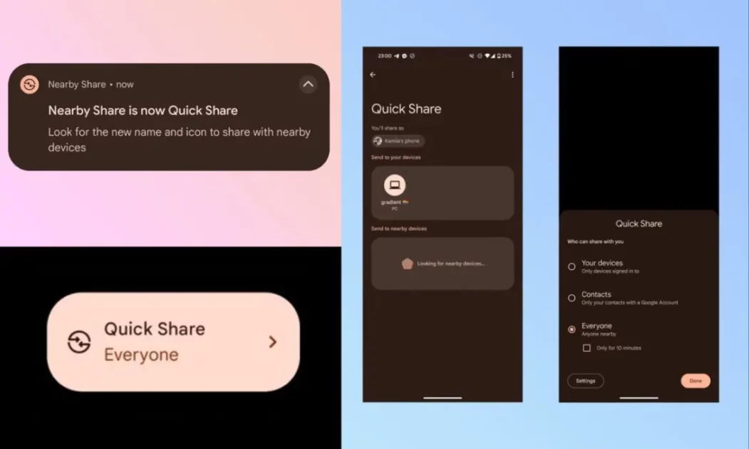 Androidの近くの共有は、迅速な共有としてブランド変更されています。 Googleは、AndroidデバイスとChromebookのユーザーエクスペリエンスを簡素化および合理化するためのより広範な取り組みの一環として、2023年12月21日にこの変更を発表しました。