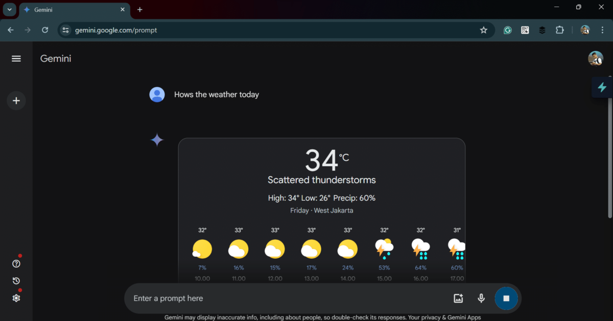 魔法のように、クロムウィンドウ内のチャットインターフェイスにすぐに向けられます。ここでは、あなたがするのと同じように、あなたの質問、プロンプト、またはジェミニのリクエストを入力できますジェミニのウェブサイト。