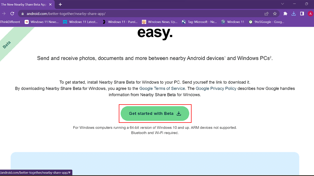 - Google'sにアクセスしてください近くの共有ページ>をクリックします '始めましょう'アプリをダウンロードするボタン。