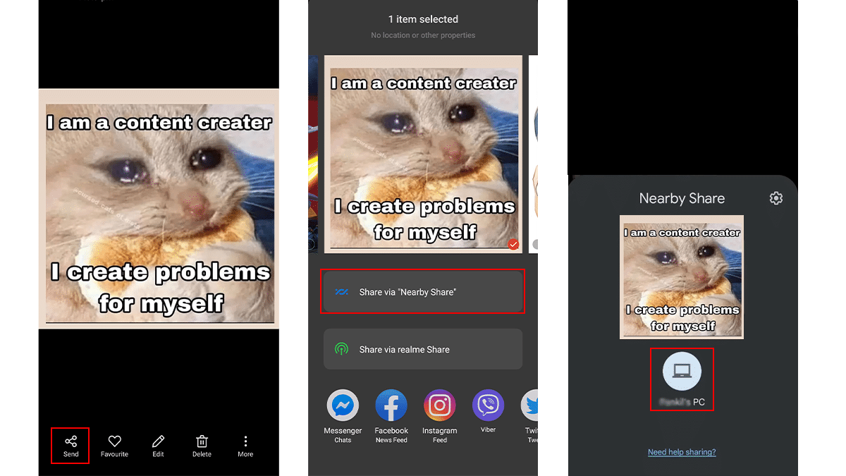 - 開けるファイルマネージャー>共有するコンテンツを右クリック> [近くの共有で送信]をクリックします。