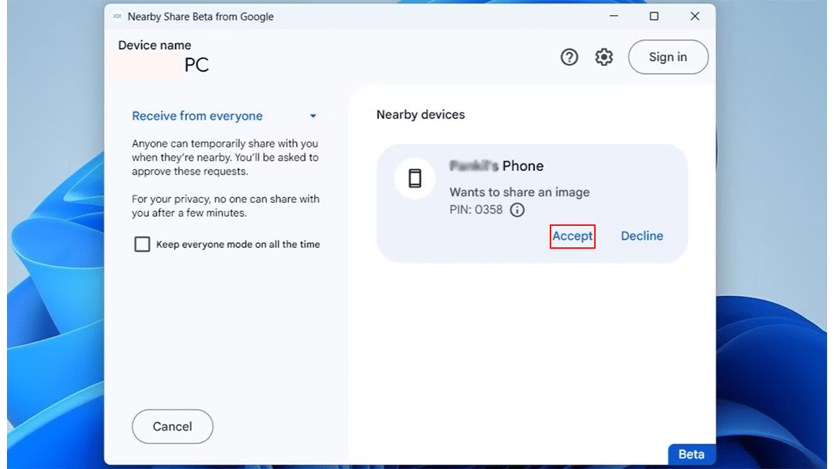 - PCで、近くの共有アプリを開いてクリックします受け入れるファイルを受信します。