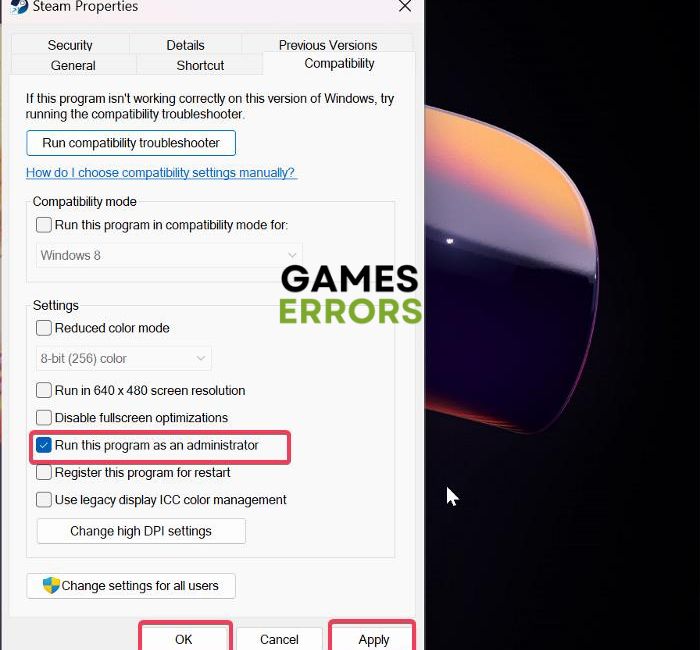 3. 設定セクション、確認してください。このプログラムを管理者として実行します