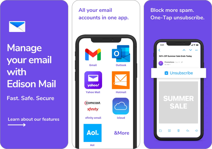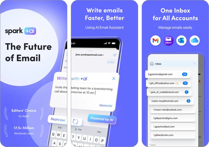 互換性:iOS、MacOS、Android、およびWindowsで利用でき、Gmail、Yahoo、Outlook、Icloud、Office 365、およびその他のIMAPアカウントをサポートしています。