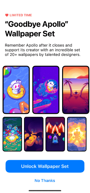 Christian SeligのApolloアプリは、その驚くべき機能と細心のデザインで認識されています。特に、このアプリは、委託されたアーティストによってキュレーションされた幅広いアイコンオプションを提供し、競合他社とは一線を画しています。別れのジェスチャーとして、セリグは「さようならアポロの壁紙セット。」