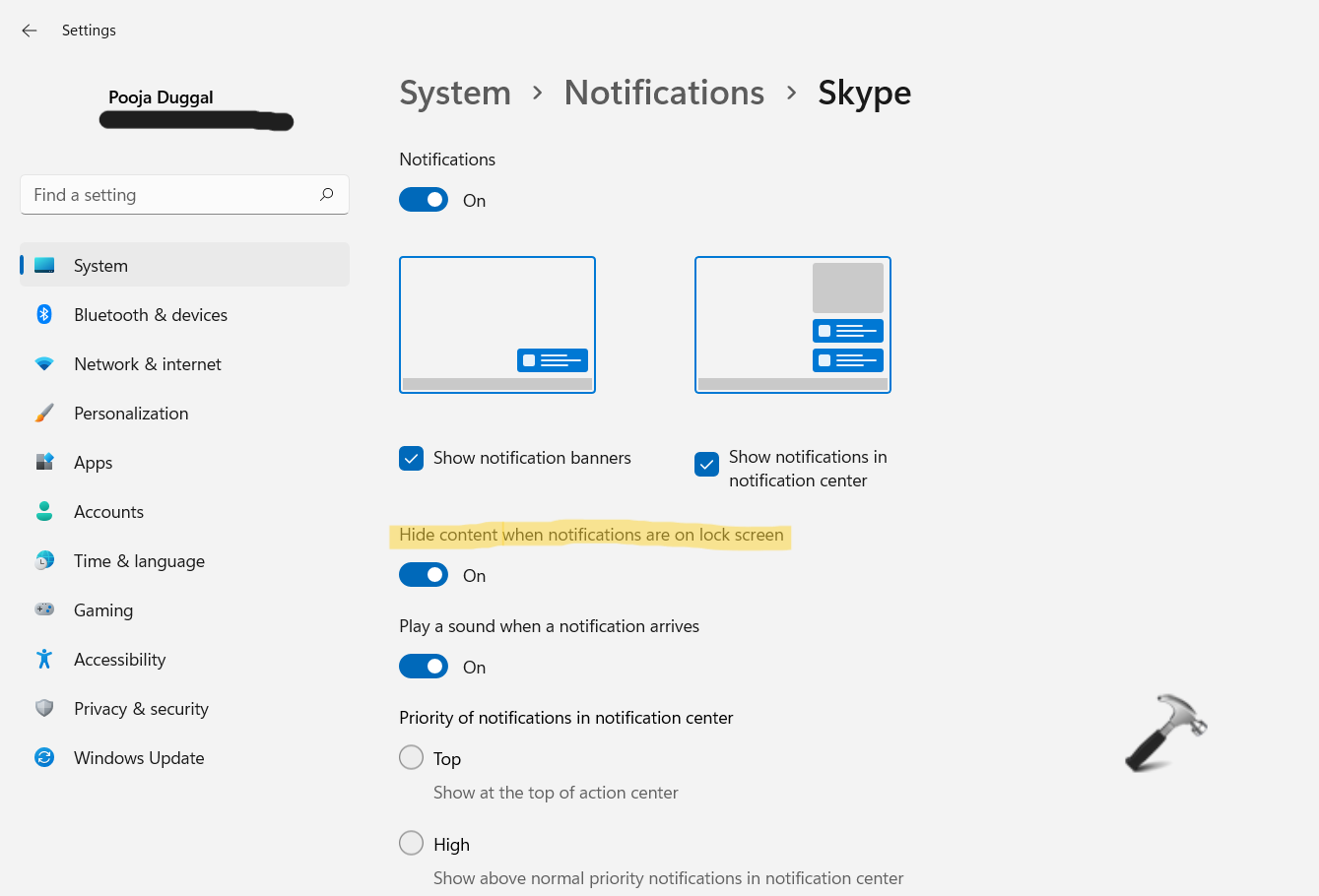 3。次に、スイッチを切り替えますの上の隣に存在します通知がロック画面にあるときにコンテンツを非表示にします。