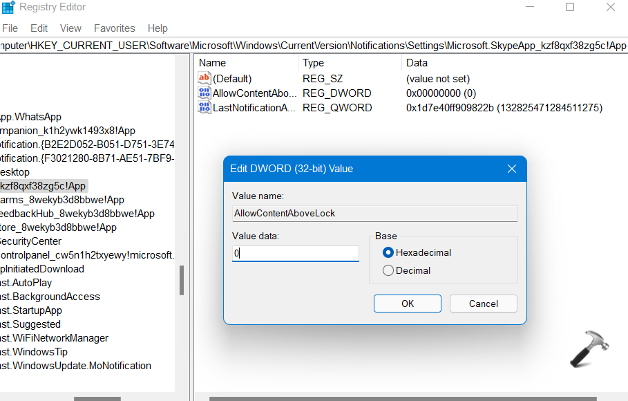 4。右ペインで、ダブルクリックしますAllowContentAbovelockDWORD値。完了したら、その値を変更します0ロック画面にコンテンツを隠して押しますわかりました。