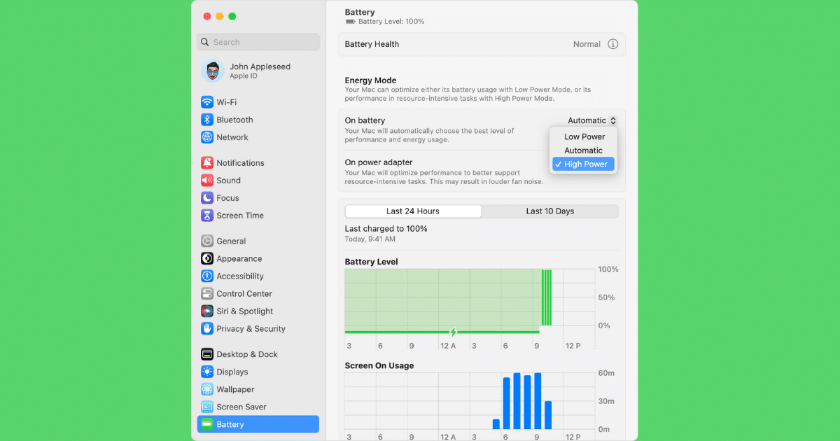 MacOS Venturaおよびその後のバージョンを使用すると、ユーザーはシステム設定アプリ、特にバッテリーセクション内でハイパワーモードをシームレスにアクティブにすることができます。方法は次のとおりです。