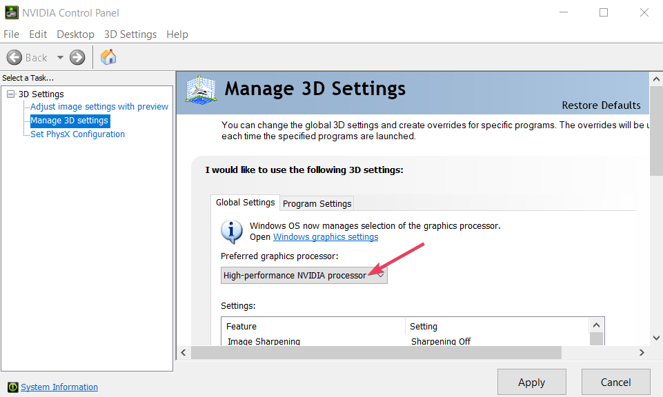 - 今、下このプログラムには、優先グラフィックプロセッサを選択します、高性能NVIDIAプロセッサオプションを選択します。
