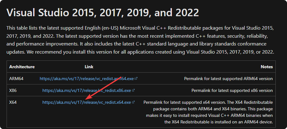 - に行きますMicrosoft Visual C ++再配布可能なページ。