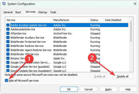 - ティックすべてのMicrosoftサービスを非表示にしますクリックしますすべてを無効にします。