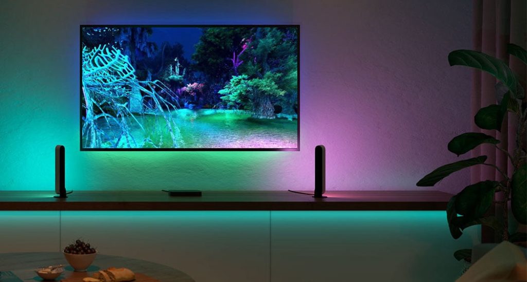 画面がある色から別の色に移行すると、ライトもシフトします。モニターの周りの軽いストリップは、画面上の色を反射するようにシフトする可能性がありますが、リビングルーム全体の個々の電球は変化して、映画の中に深く引っ張る雰囲気を生み出します。
