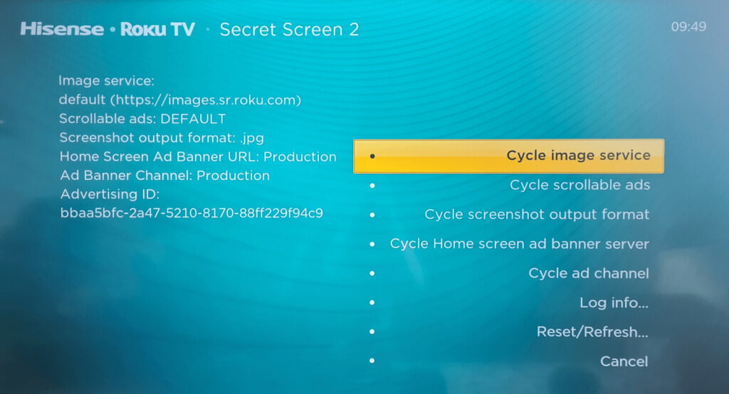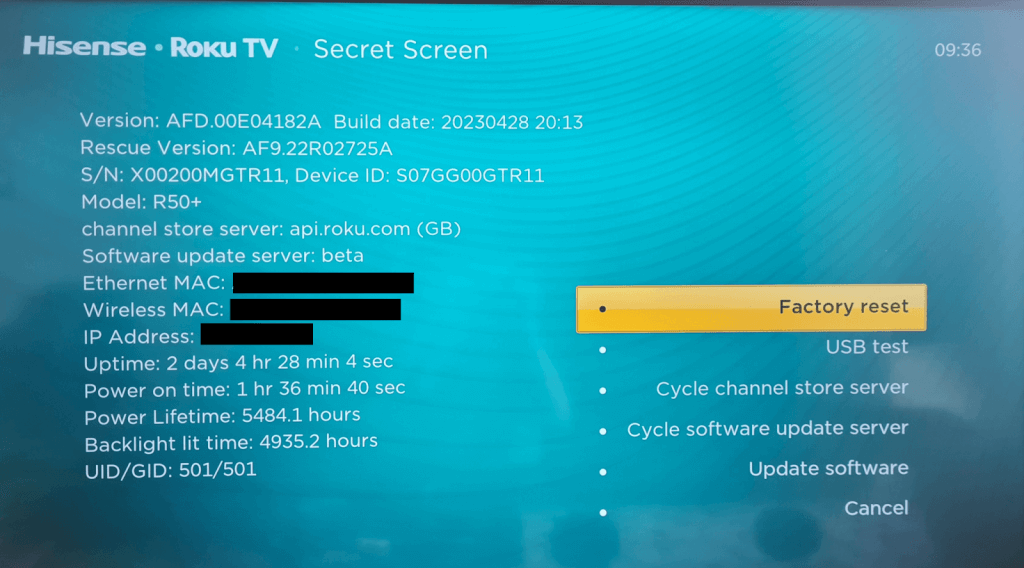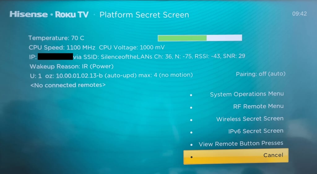 IPアドレス、CPU速度、デバイス温度、ペアリングステータスなど、Rokuデバイスについて必要なすべての情報について、Roku Platform Secretメニューはアクセスするものです。ここから、ボタンのタッチでRFリモートメニューとシステム操作メニューにアクセスすることもできます。
