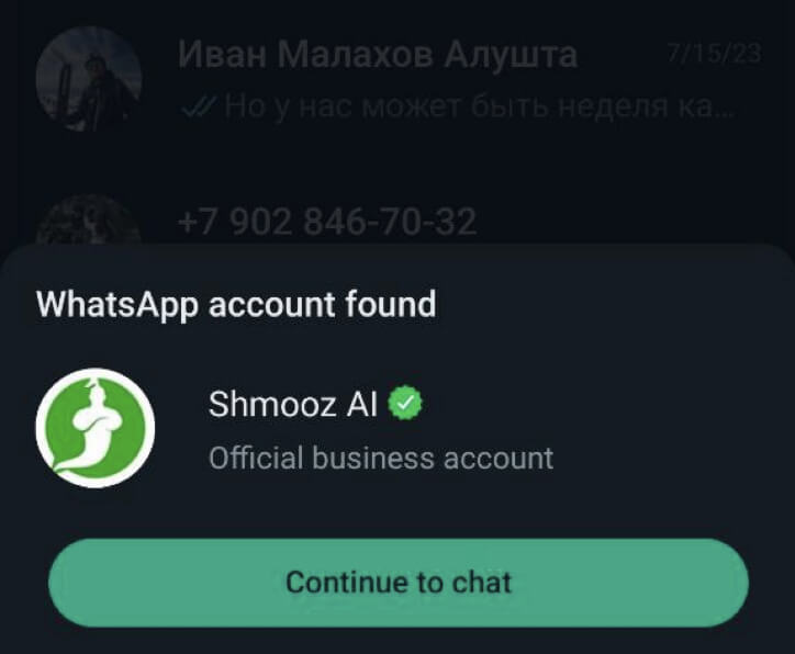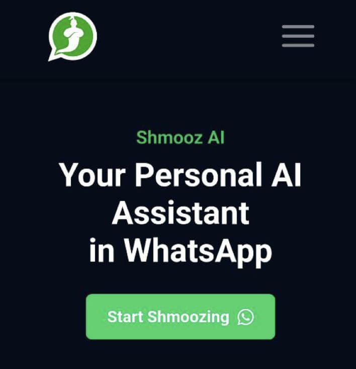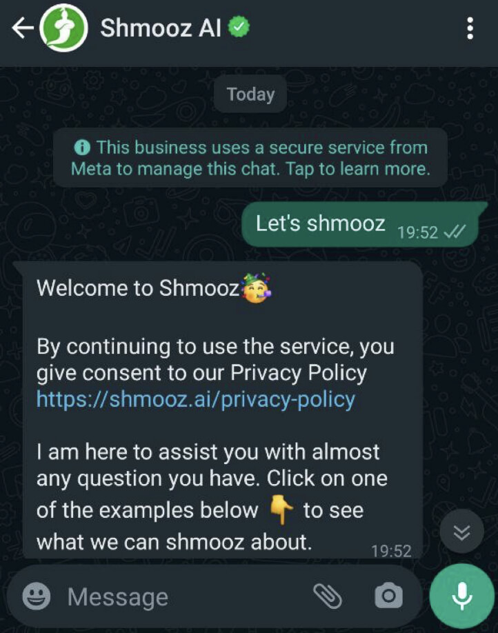 - その後、WhatsAppが開き、Chatbot(Shmooz AI)が上部に表示されます。