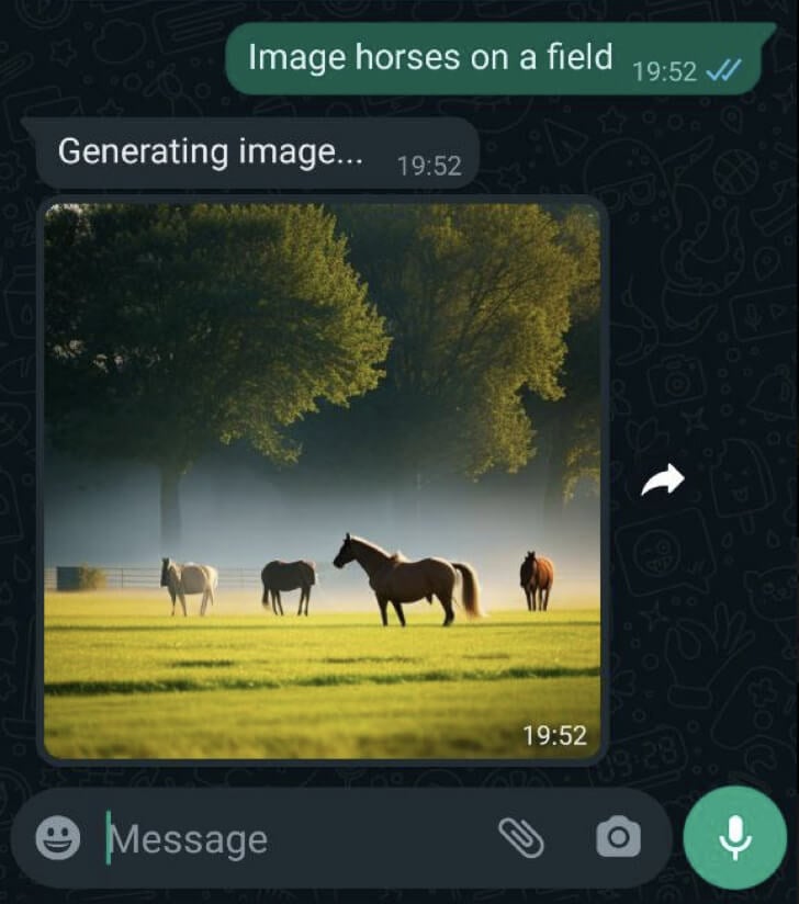 テキストの応答は別として、これらのWhatsAppチャットボットはよりエキサイティングなタスクを実行できます。たとえば、それらを使用して画像を生成できます。単語を追加するだけです画像テキストのプロンプトの前に、1024 x 1024の解像度で見事な写真が届きます。