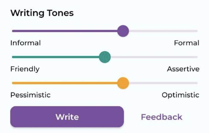 - あなたの執筆のトーンをより強く制御します。 AIに生成された応答をさらに制御するために、形式的と非公式、友好的で断定的で、悲観的で楽観的なトーンを選択して、調整を調整できます。スライダーを使用すると、好みに応じて応答をカスタマイズできます。