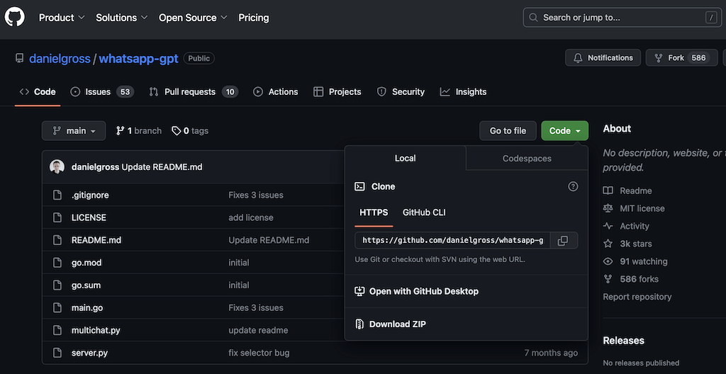 Pythonスクリプトを使用してChatGptをWhatsAppと統合するには、whatsapp-gpt githubページ、コードをダウンロードし、画面の指示に従って、WhatsAppアカウントでChatGPTを実行します。