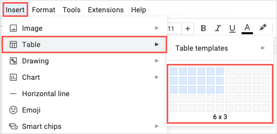 テーブルを追加できますGoogleドキュメント必要な行と列の数を選択するだけです。