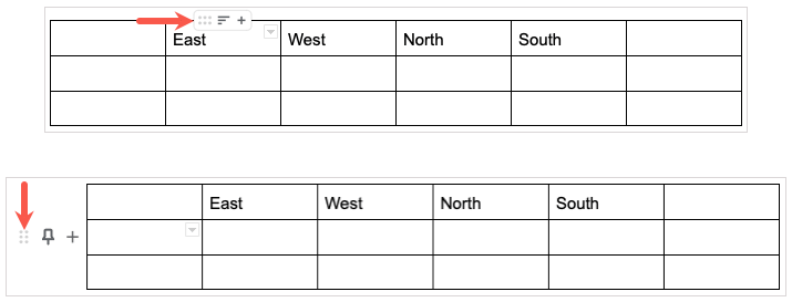 カーソルを列または行の上にホバリングして、小さなツールバーを表示します。を選択しますグリッドツールバーの左側にあるアイコンは、列を左または右または下または下にドラッグします。