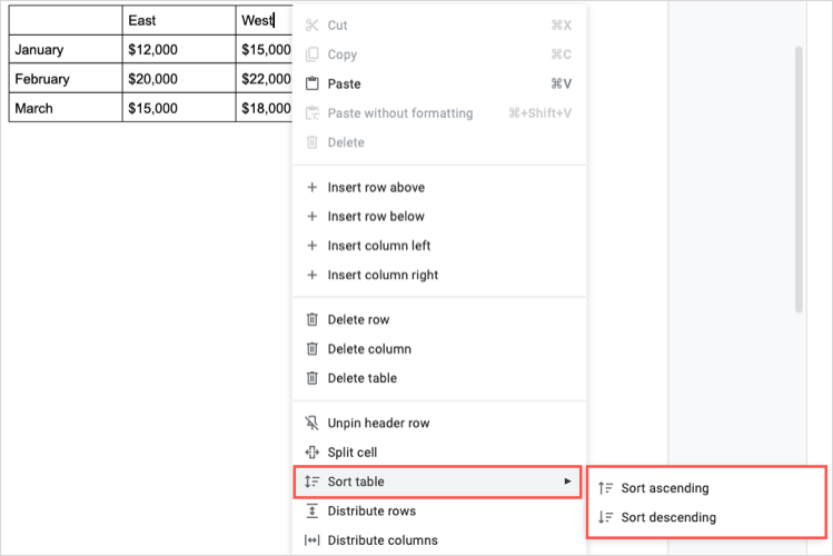 列を右クリックして、移動することもできますテーブルをソートします、そして選んでください昇順をソートしますまたは下降をソートしますポップアウトメニューで。
