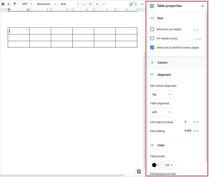 データを追加する前に、テーブルの外観に変更を加えることをお勧めします。 Google Docsテーブルの行、列、アライメント、カラープロパティを調整できます。