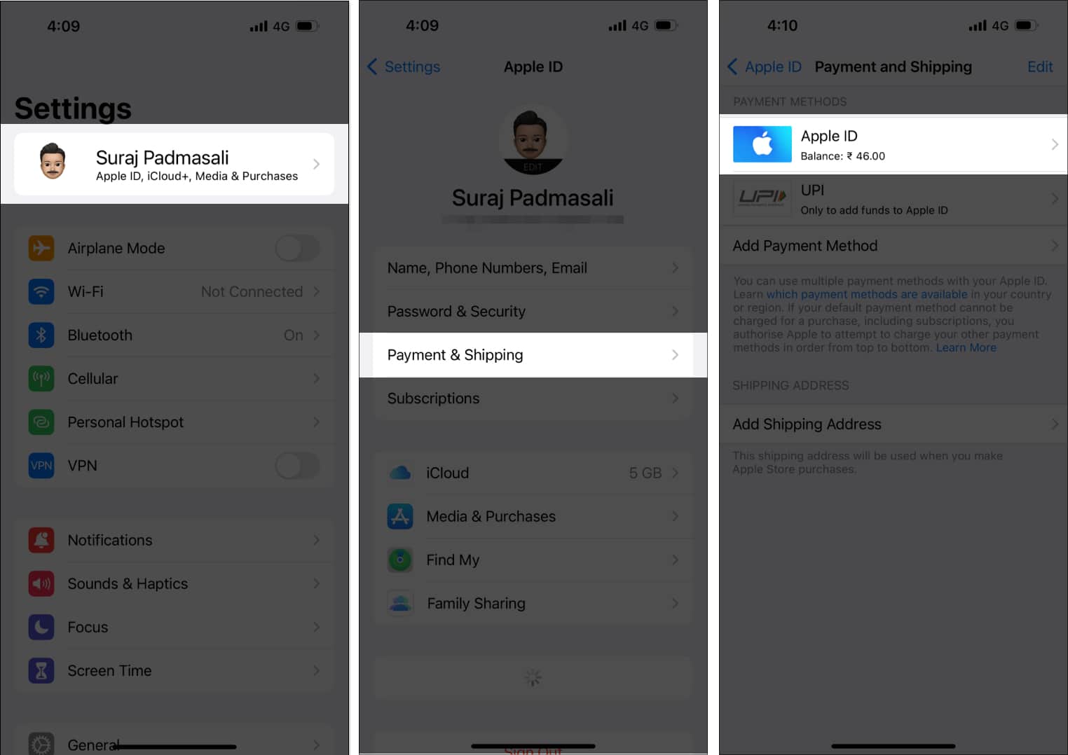 設定アプリ:タップします名前カード(AppleID)→選択支払いと送料。隣の利用可能な金額が表示されますバランスApple IDの下。