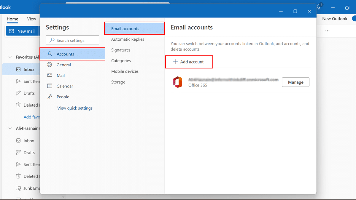 - クリックしてくださいアカウント>クリックしますメールアカウント>クリックしますアカウントを追加しますオプション。