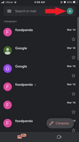 - 画面の右上隅にあるユーザーアイコンをタップします。これにより、Gmailアプリのアカウント設定に表示されます。