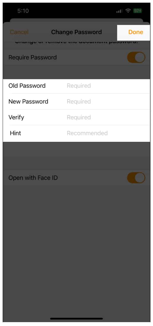 Face IDを有効にしている場合、オンに切り替えるオプションが表示されます顔IDで開きますに iPhoneにパスワードが設定したページドキュメント。さらに、ヒントボックスにパスワードヒントを提供することで、自分自身を支援できます。