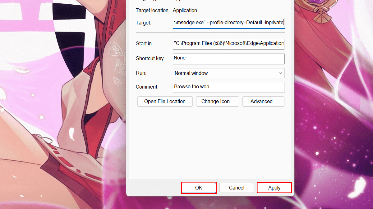 "C:Program Files (x86)MicrosoftEdgeApplicationmsedge.exe" --profile-directory=Default -inprivate