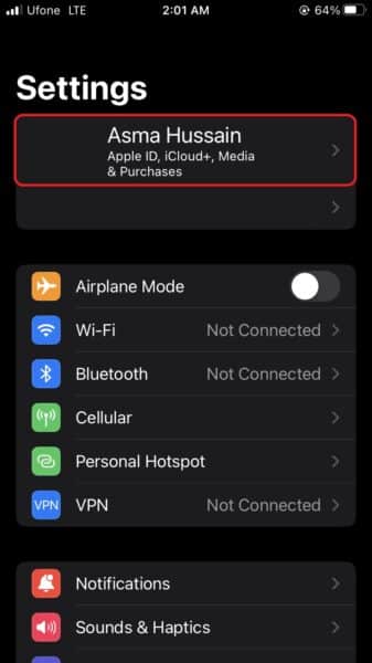 - 設定アプリに入ったら、画面の最上部にある名前を探してタップします。