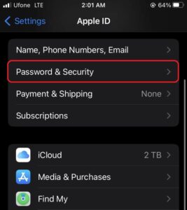 - あなたが見つかるまで下にスクロールしますパスワードとセキュリティオプションとそれをタップします。