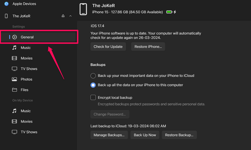 3。iPhoneがWindows 11のAppleデバイスアプリに表示されたら、一般的なサイドナビングバーからのタブ。