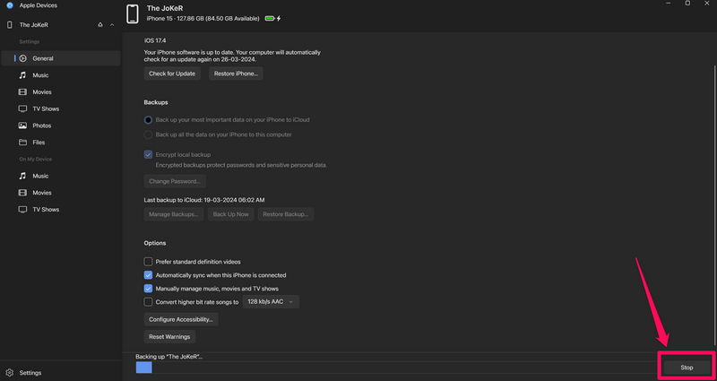 8。ただし、バックアップが開始されるとiPhoneを使用できます、 あなたWindows 11 PCから切断することはできませんまたはラップトップ。