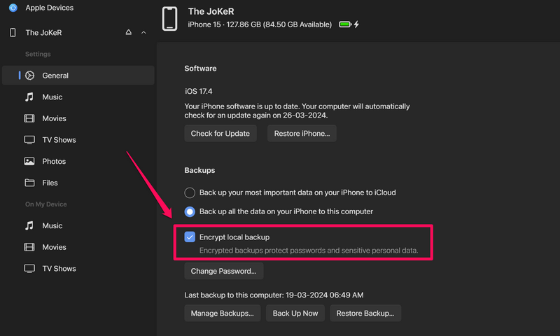 5。今、あなたがローカルのiPhoneを暗号化したいなら、あなたはボックスを確認してくださいのためにローカルバックアップを暗号化しますオプション。