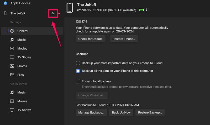 11。バックアッププロセスが完了したら、できますiPhoneを排出しますAppleデバイスアプリとPCから切断しますまたはラップトップ。