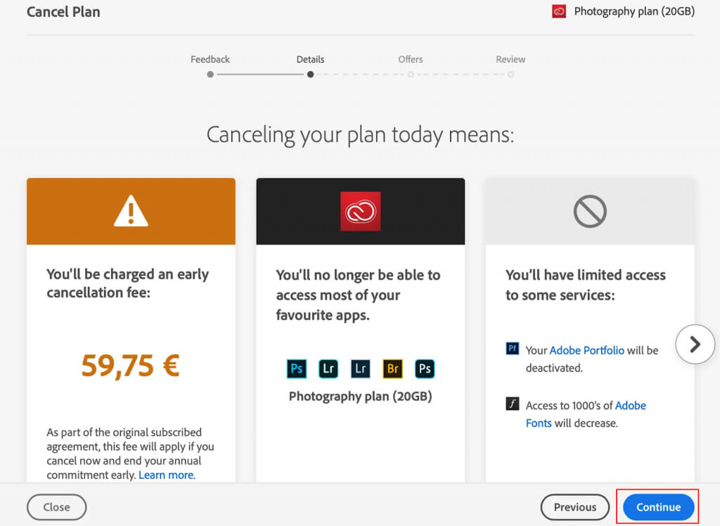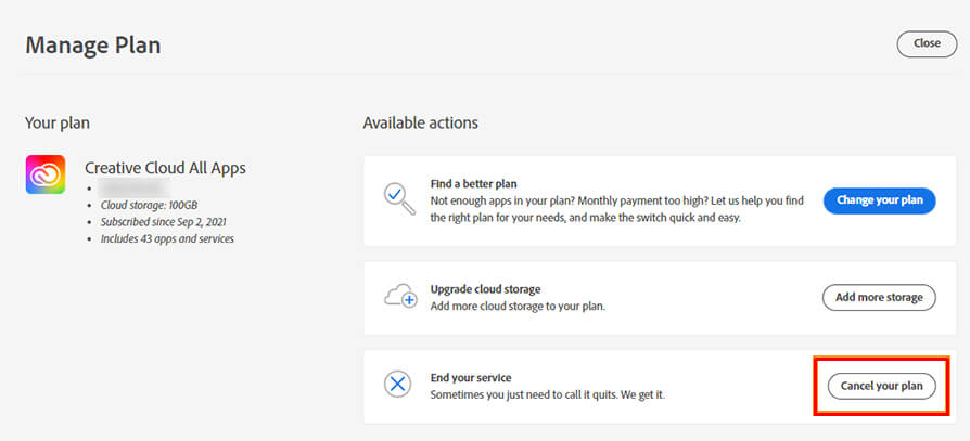 - Adobeが計画を変更するか、キャンセルするかを尋ねる新しいウィンドウがポップアップします。選択します計画をキャンセルします続行する。