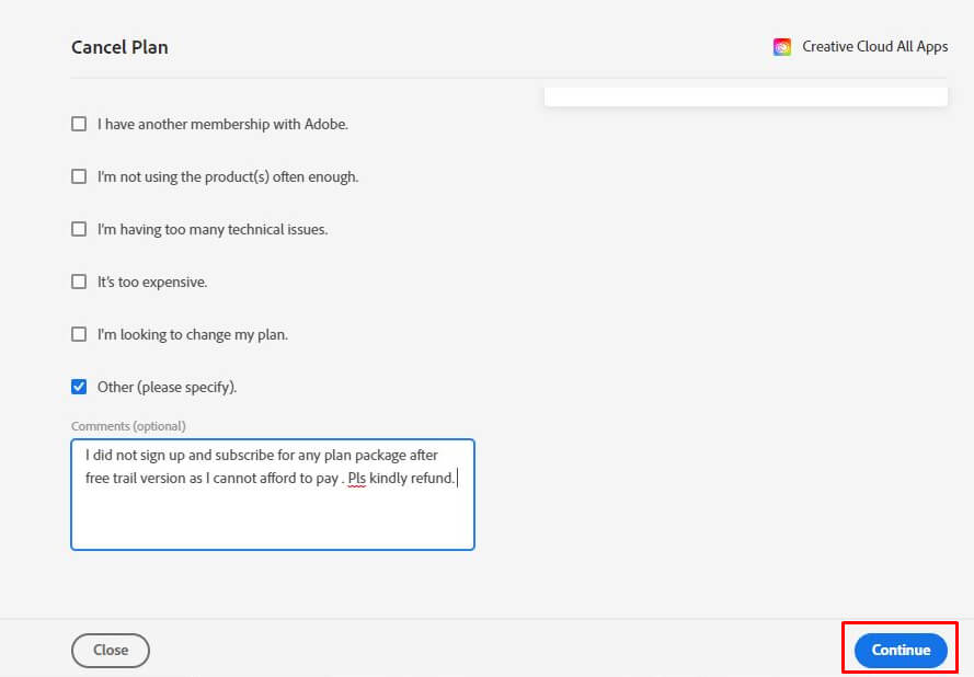 - あなたのケースを説明する答えの横にあるボックスを刻むことによって、あなたがAdobeを離れる理由を選択してください。必要だと思われる場合は、コメントを書くこともできます。完了したら、クリックするだけです続く。