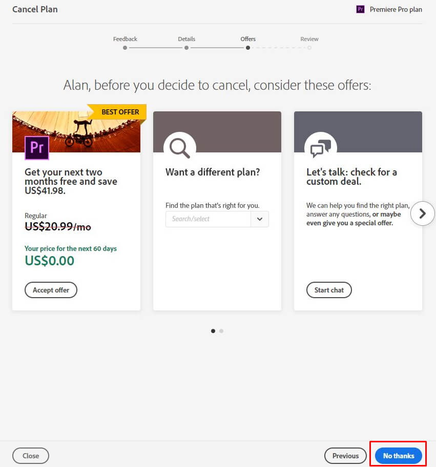 - Adobeは顧客を失うのが好きではなく、計画をキャンセルする代わりに計画を変更するようにあなたを説得するように再度努力します。を選択します結構ですAdobeのキャンセルに心が設定されている場合はオプションです。
