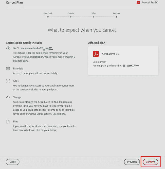 - 最後に、次のページにはすべてのキャンセルの詳細が表示されます。間違いがないことを確認してください。選択します確認する、Adobeサブスクリプションはキャンセルされます。