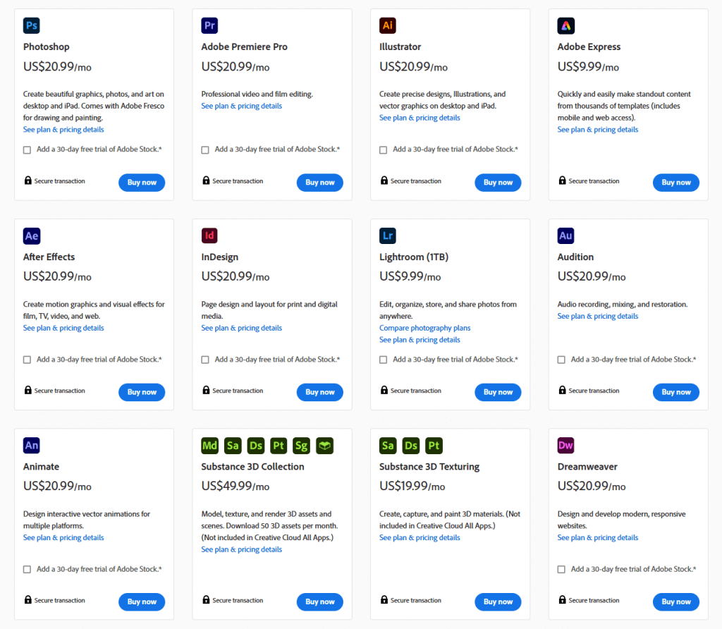 Adobe Acrobat ProまたはPhotoshopサブスクリプションをキャンセルする場合は、Adobe Creative Cloudの他の要素をAdobe StockやIndesignなどの他の要素も放棄する必要があります。
