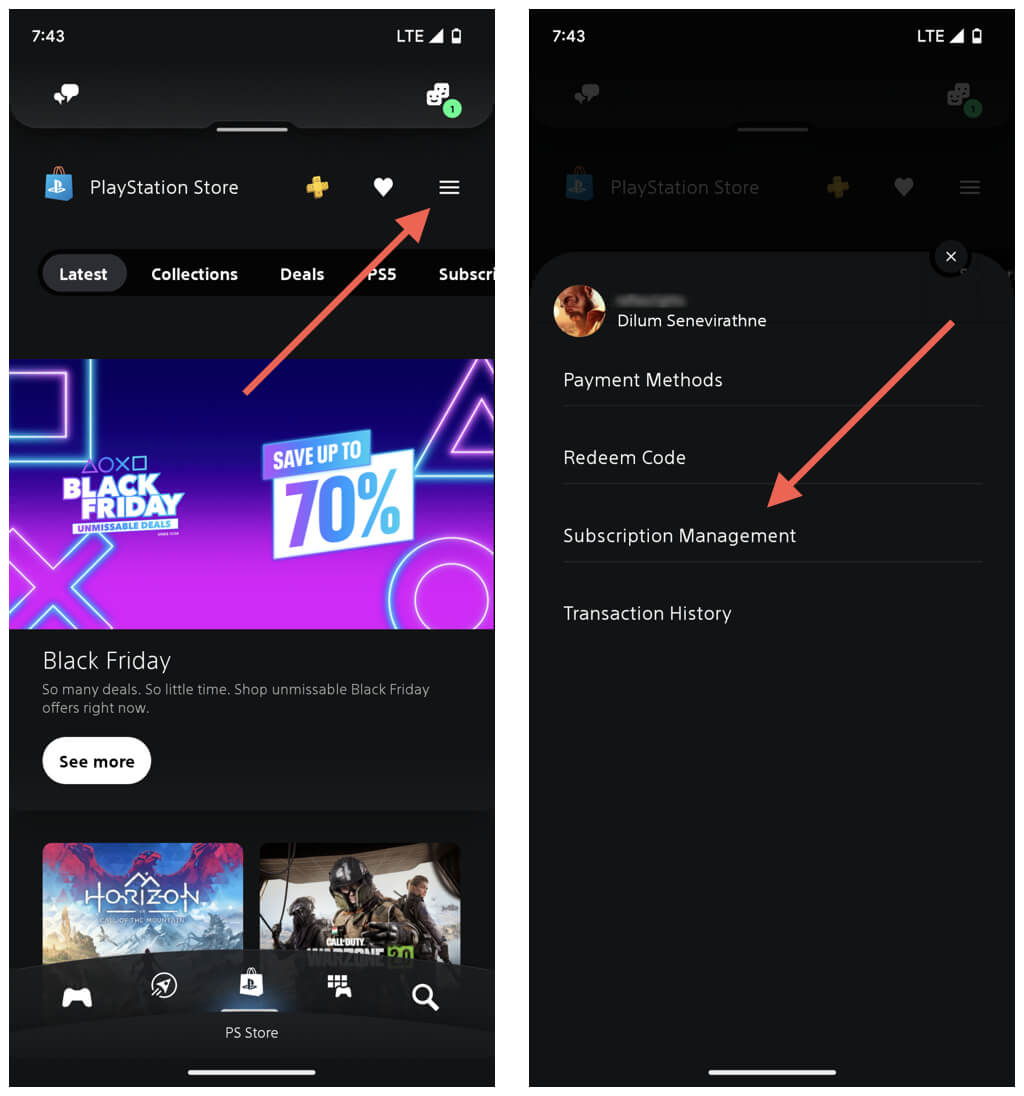 PSアプリがAndroidまたはiPhoneにセットアップされている場合は、それを使用してPlayStation Plusサブスクリプションをキャンセルできます。に切り替えますPlayStationストアタブ、タップしますメニューアイコン(3つの積み重ねられた行)、および選択サブスクリプション管理。