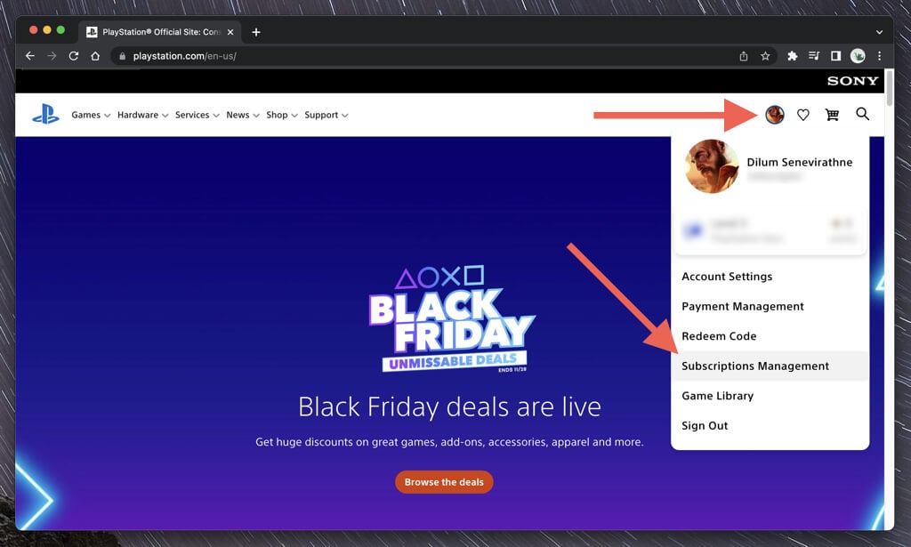 サインインするだけですPlayStation.comPSN資格情報で。アカウントに2要素認証が必要な場合は、携帯電話で受け取ったコードを入力して、あなたであることを確認する必要があります。次に、画面の左上隅にあるプロフィールポートレートを選択し、選択しますサブスクリプション管理。