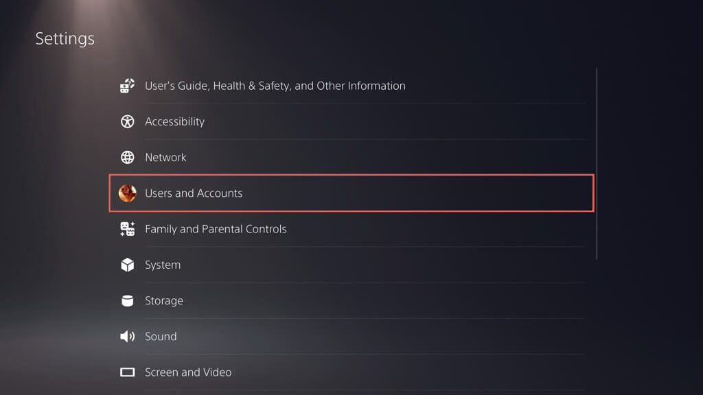 - [設定]メニューを下にスクロールして入力しますユーザーとアカウント(ps5)またはアカウント管理(PS4)カテゴリ。