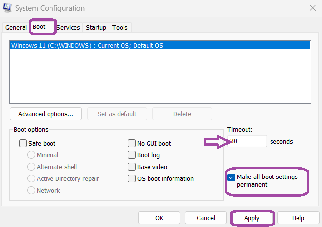 4.すべてのブート設定を永続的なオプションに確認してください。
