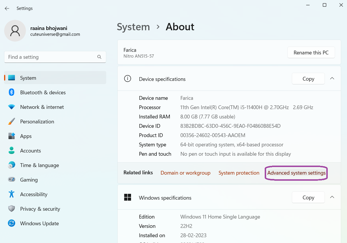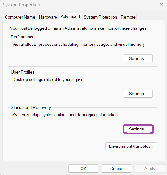4. [[詳細]タブをクリックして、[起動]および回復セクションの[設定]をクリックします。