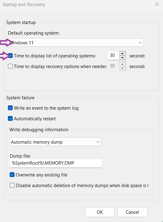 5。スタートアップと回復ウィンドウで、デフォルトのオペレーティングシステムを選択します。