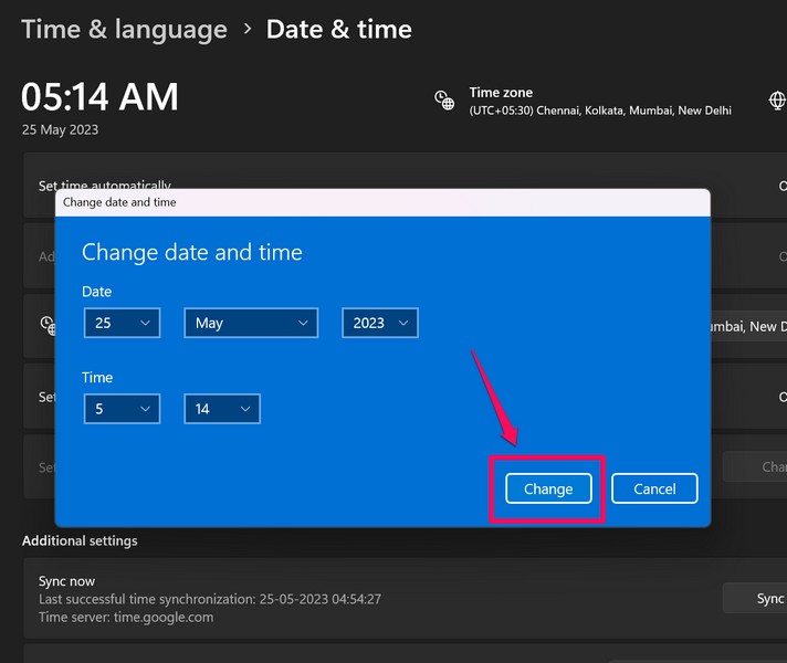 5。これで、クリックするだけです変化の横にボタン日付と時刻を手動で設定しますWindows 11で変更日と時刻UIを開くオプション。
