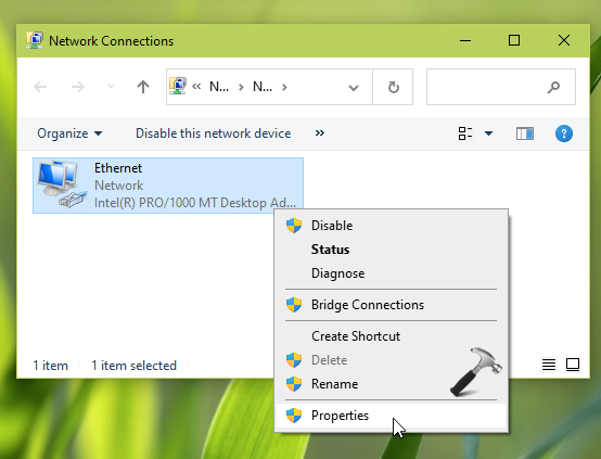 2。[ネットワーク接続]ウィンドウで、現在アクティブなネットワークアダプターを選択し、それを右クリックします。プロパティ。