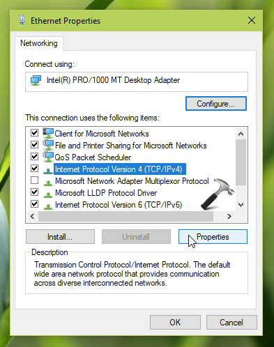 3。次に、プロパティシートで選択しますインターネットプロトコルバージョン4(TCP/IPv4)オプションとクリックしますプロパティ。